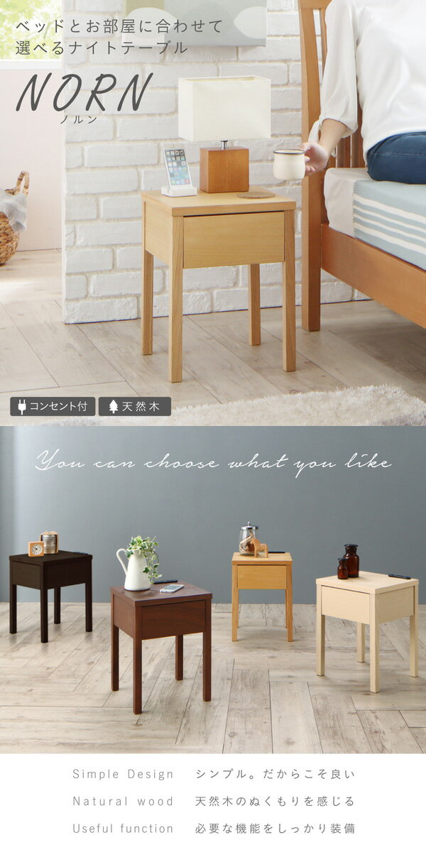 コンセント・引き出し付き ナイトテーブル 【NORN】ノルン W30 ウォールナットブラウンテーブル【サイズ】W30:幅30×奥行き30×高さ40cm【重量】W30:6kg【その他サイズ情報】W30:引き出し内寸:幅20×奥行き18×高さ6cm【その他機能情報】2口スライドコンセント付き【材質】天板:タモ材仕上げ:ウレタン塗装天板:ウォールナット材天板:オーク材【生産国】中国【その他仕様】完成品【組立について】※完成品でのお届けとなります。