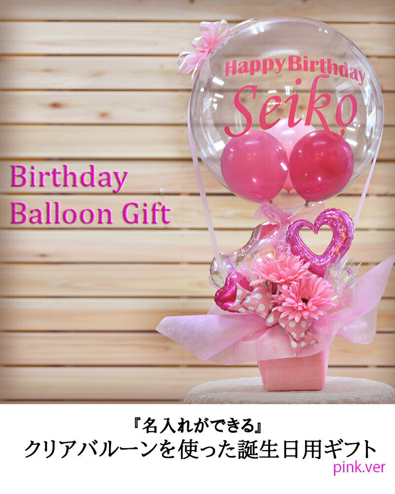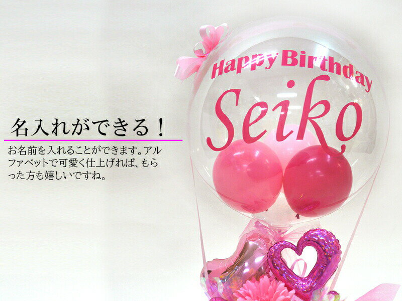 クリアバルーンを使用した気球バルーン型のバルーンギフト 名入れができるのでもらう方のお名前が入れられる バースデープレゼントです 子供たちはもちろん大人の女性にもおすすめの 可愛さいっぱいのバルーンアレンジですよ。